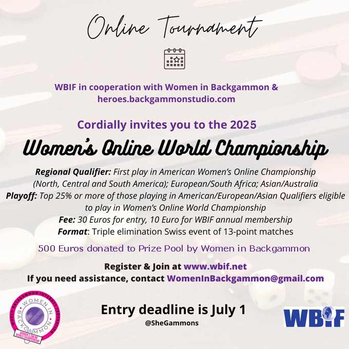 - Women in Backgammon (www.womeninbackgammon.com) is a sponsor providing $500 added money!